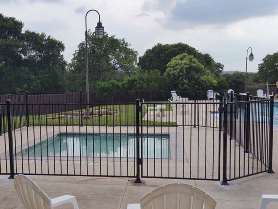 Commercial wrought iron fences offer security and visibility, making them ideal for pool areas in public settings. The sturdy design and moisture-resistant properties ensure safety by preventing unauthorized access to the pool while allowing monitoring of pool activities.